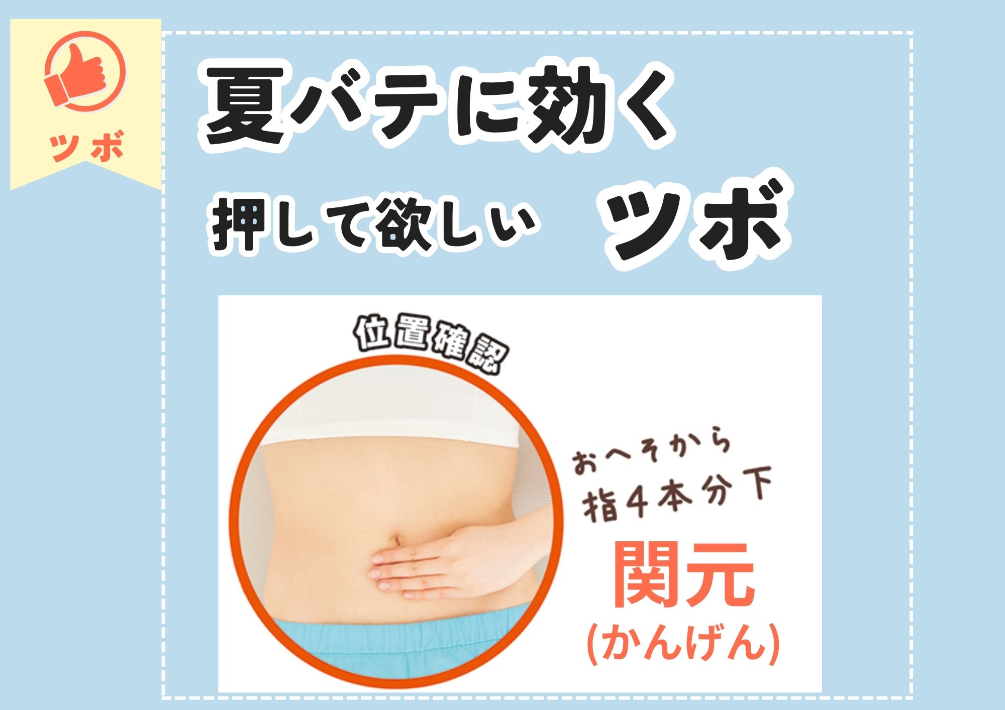 夏バテにおすすめのツボ「関元(かんげん)」 こんにちは。 武蔵境ウィル鍼灸整骨院です。 夏バテに押して欲しいツボ 「関元(かんげん)」 おへそから指4本分下にあります。 両手の指で先でじんわりと 1回3~5秒ほどおしてください。 また手のひらで下腹部を 覆って温めてみてください。 関元は 気を補い体力向上・ 胃腸の働きを整えて 全身の怠さや冷えを改善します。 ぜひお試しください。 まだまだ暑いので お身体のケアしていきましょう! 2025年08月28日